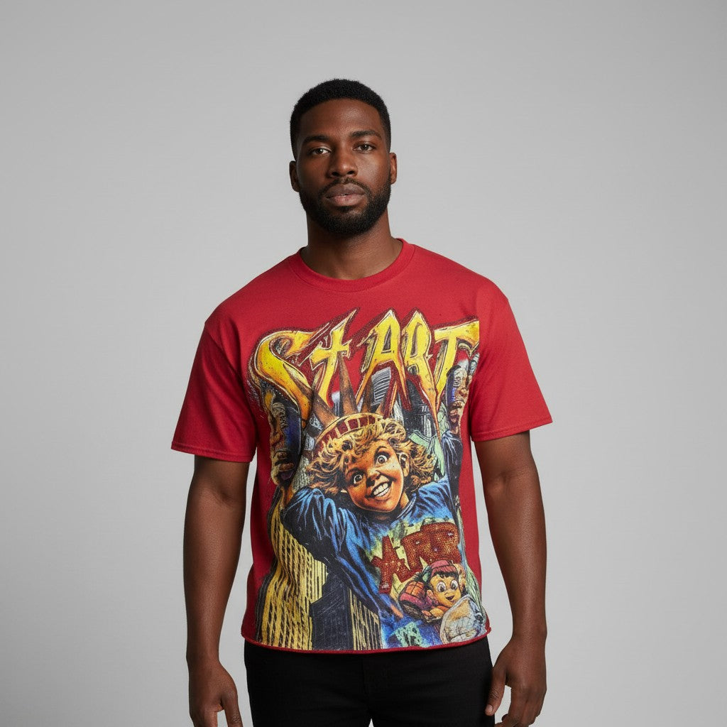 The BKYS St. Art Cropped Tee features graphics on front and back accentuated with decorative stones and glitter. Sleeves and body feature raw unfinished hems