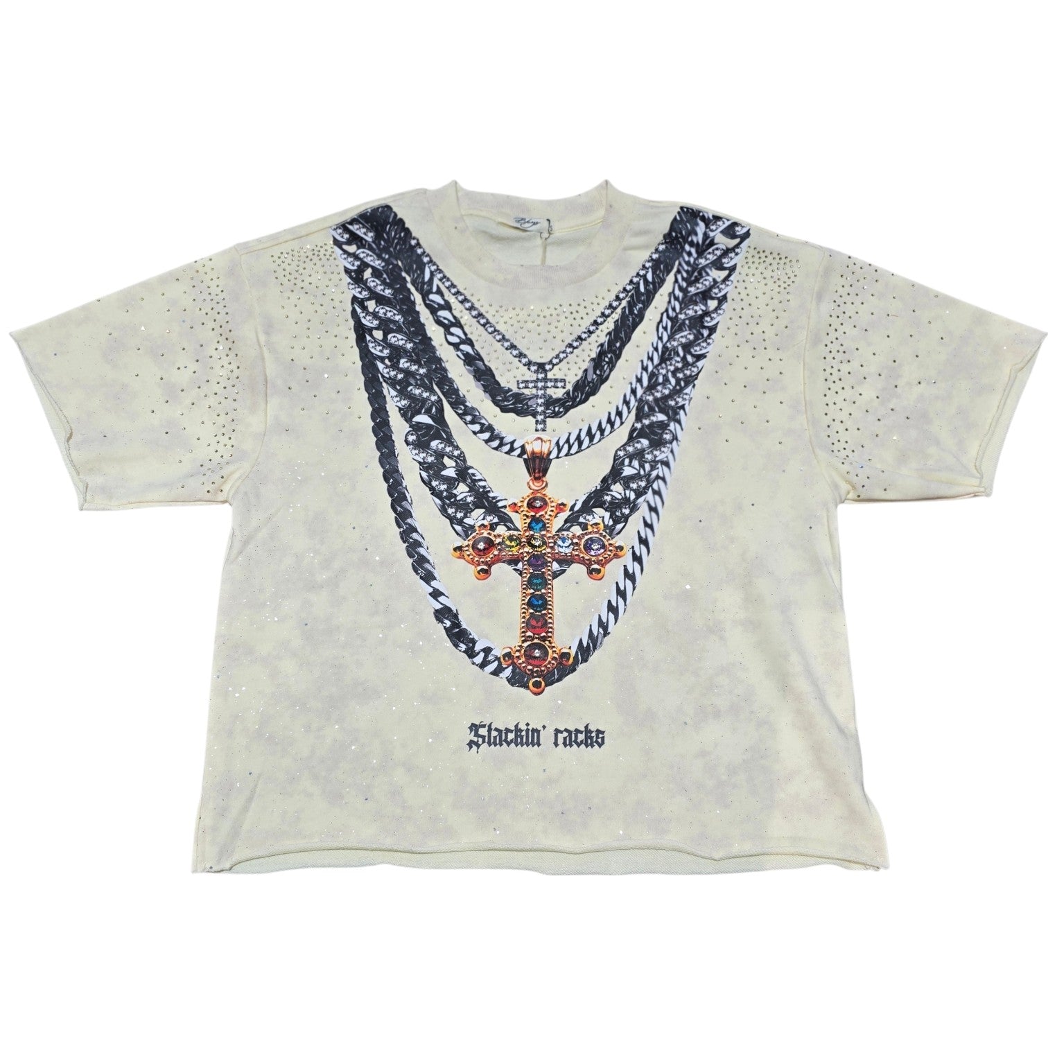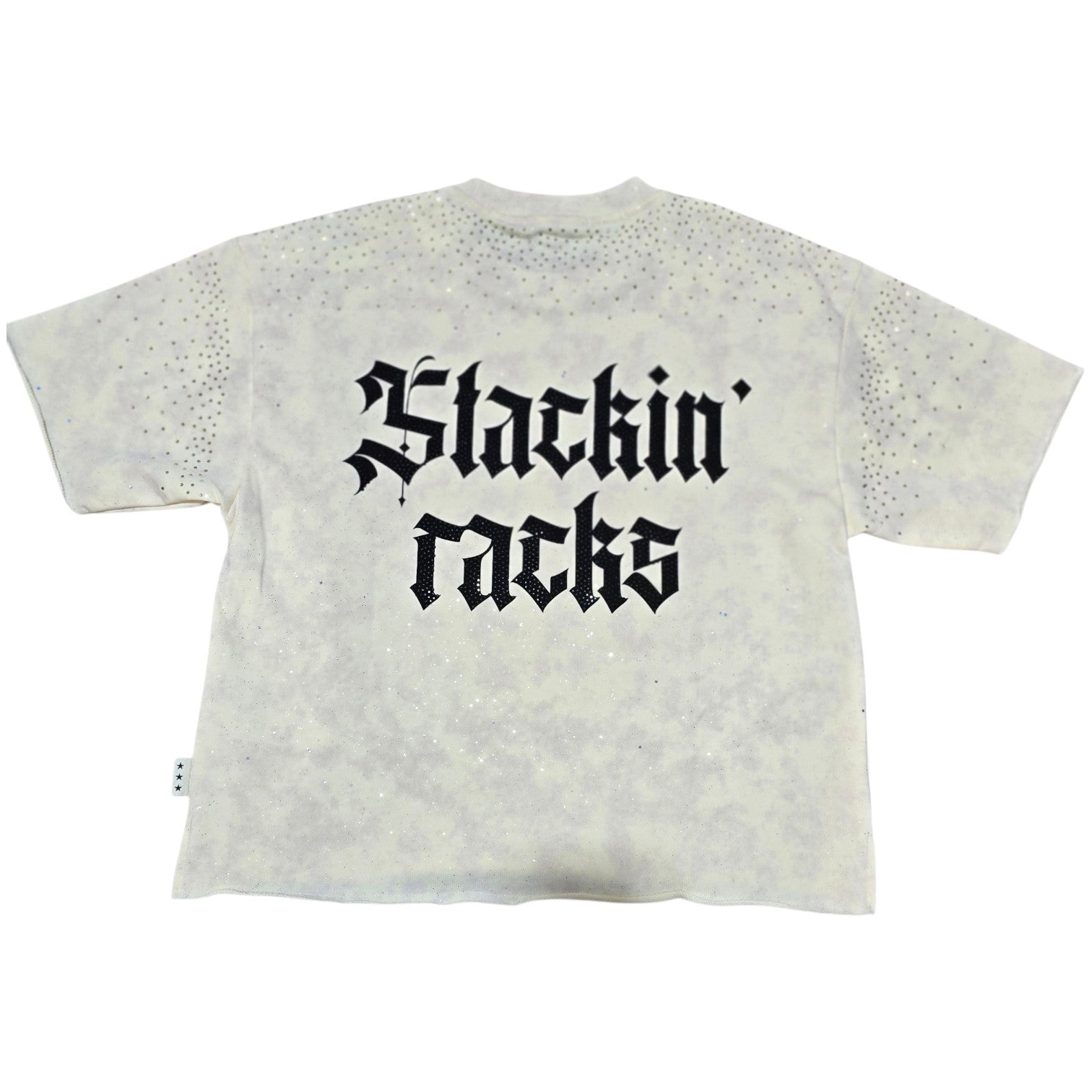 The BKYS Stackin Racks Cropped Tee features graphics on front and back accentuated with decorative stones and glitter. Sleeves and body feature raw unfinished hems