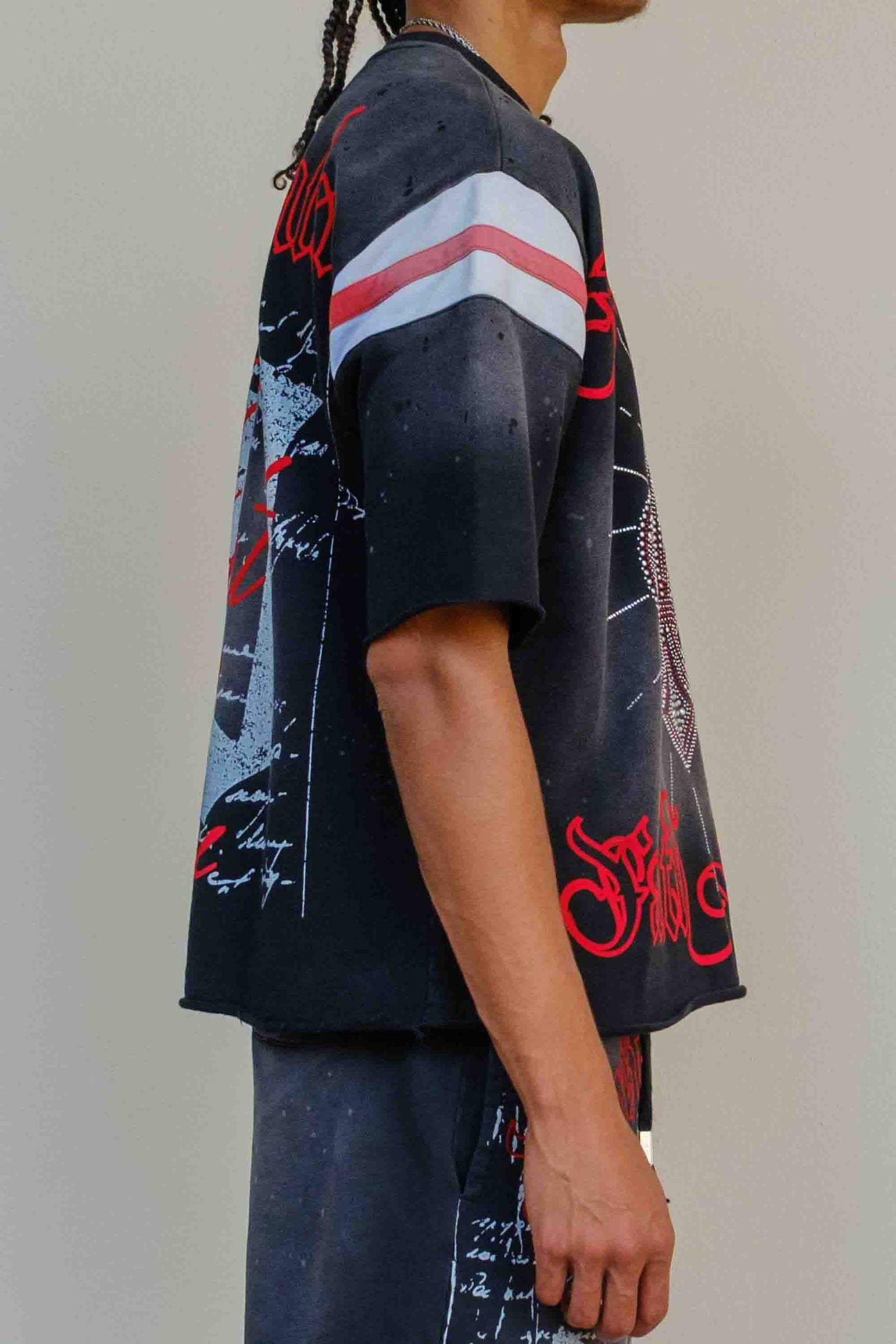 A french terry oversized crew neck tee with stud and stone detail, raw edge hem and ribbed neck.