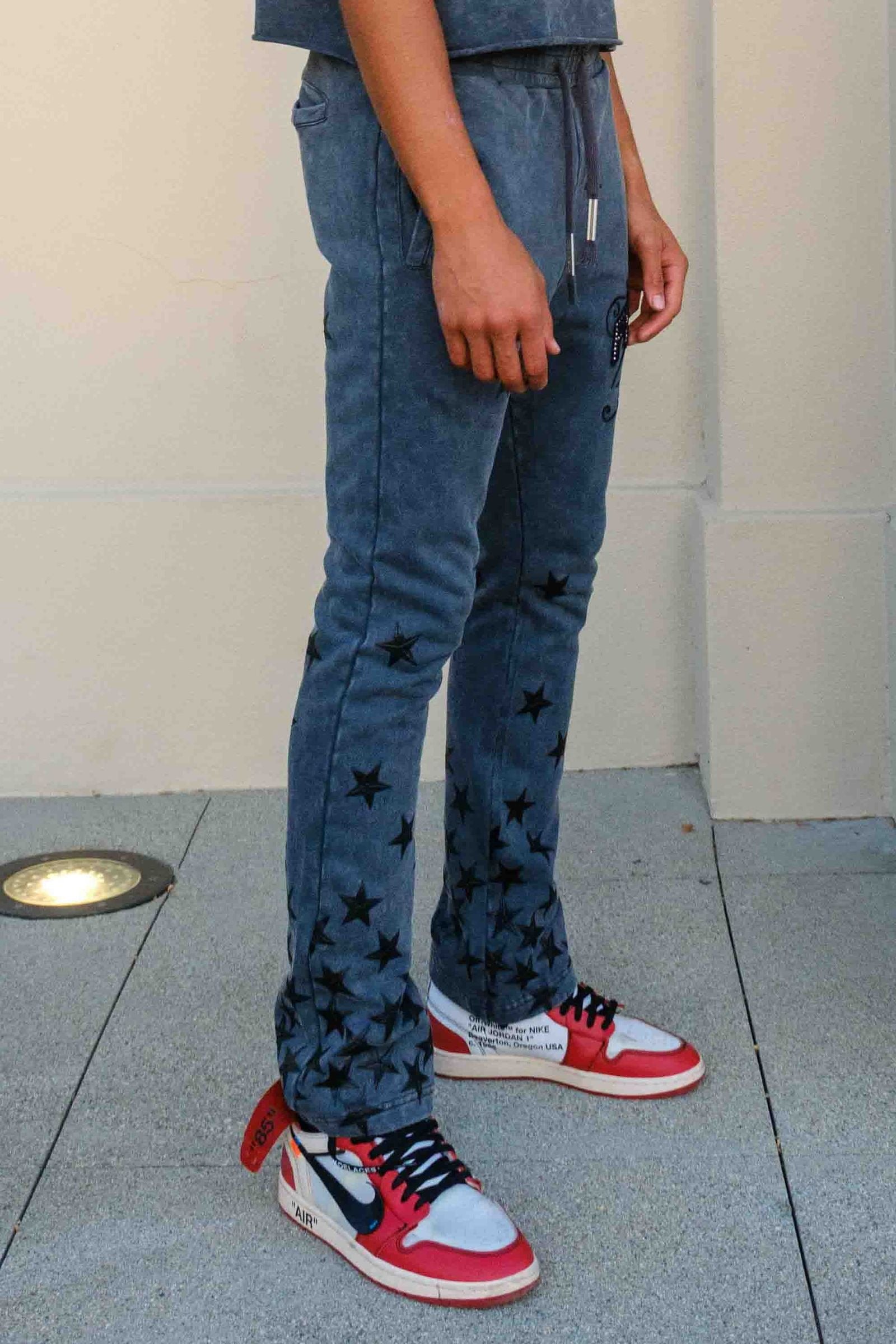 A pair of washed stack jogger with stud & rubber welding detail, elastic waist band with drawstring and front & back pocket.