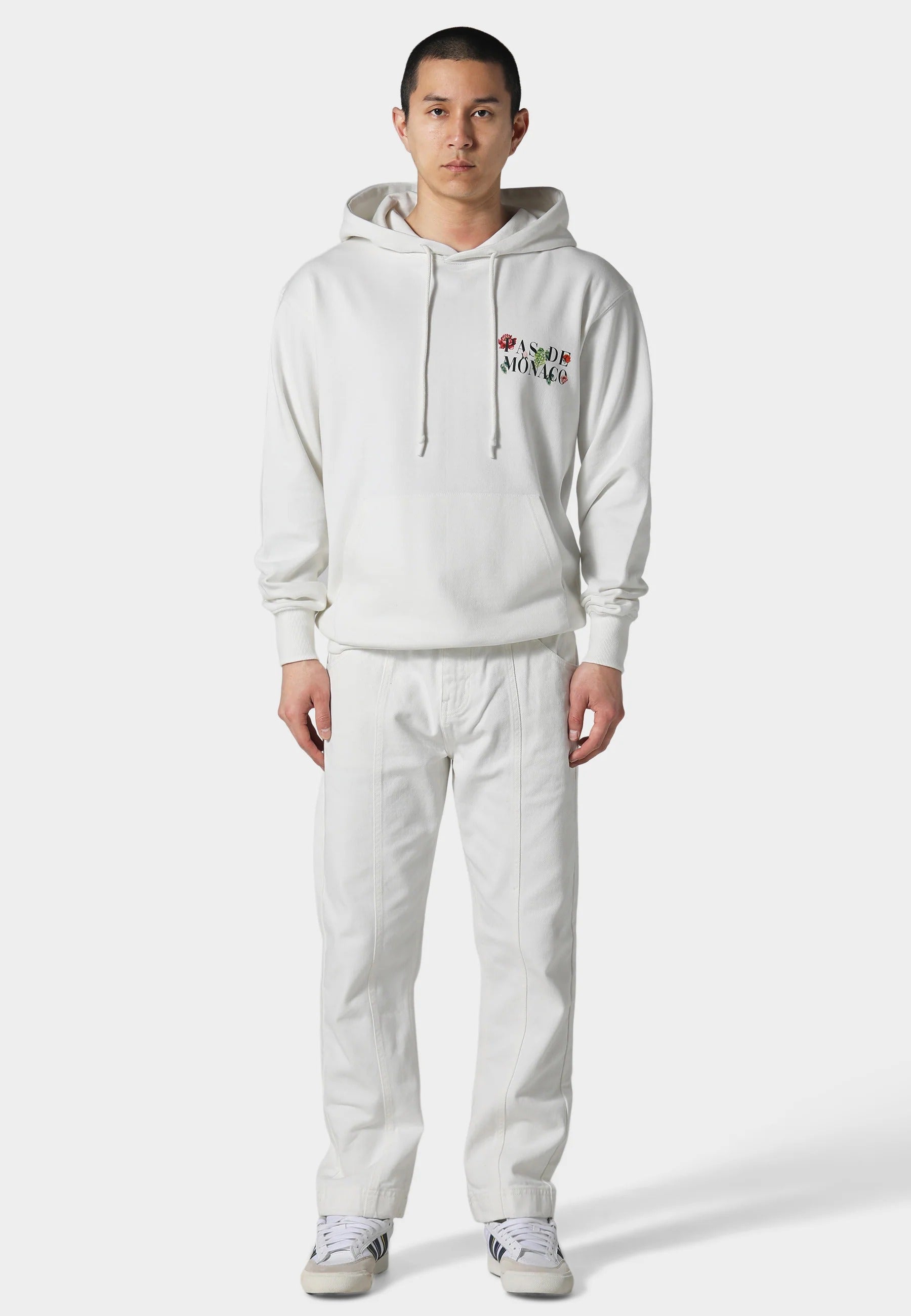 Refine your everyday style with this Florale Hoodie. Crafted from heavyweight 450 GSM loopback cotton, it offers a structured silhouette and superior comfort. Striking floral prints on the front and back deliver bold artistic expression, while a signature metal badge at the hemline adds a subtle touch of identity. A seamless blend of modern sophistication and elevated streetwear.