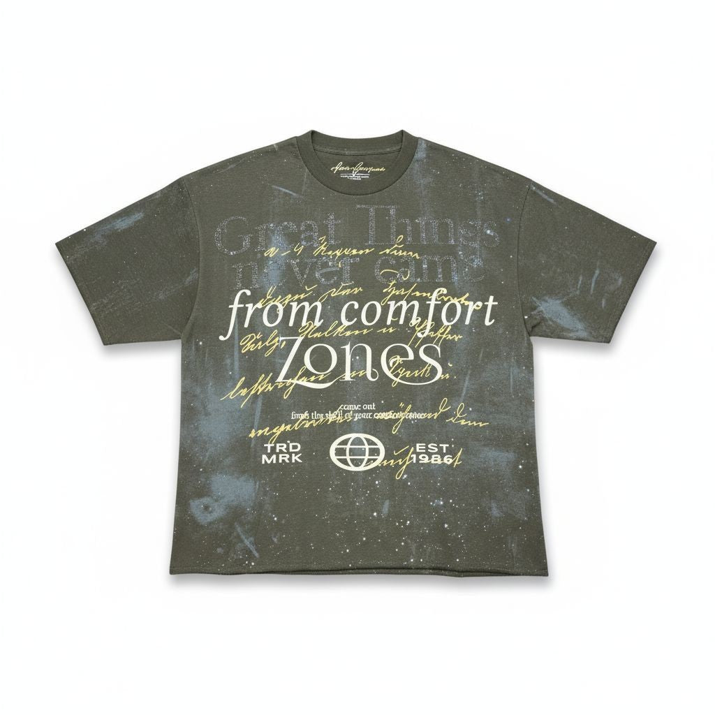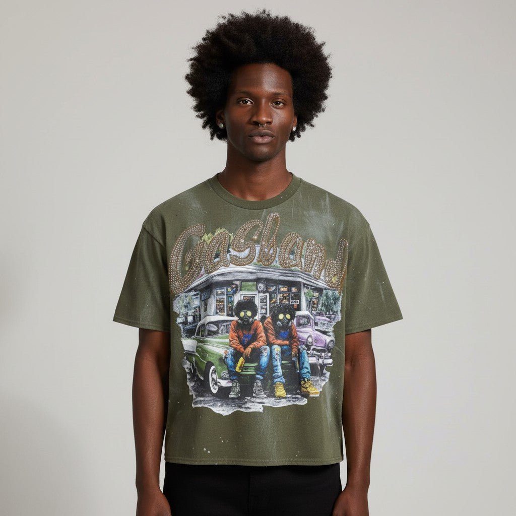 The BKYS Gasland cropped tee comes in olive with graphics on the front and back accentuated by decorative stones on the body of the shirt.